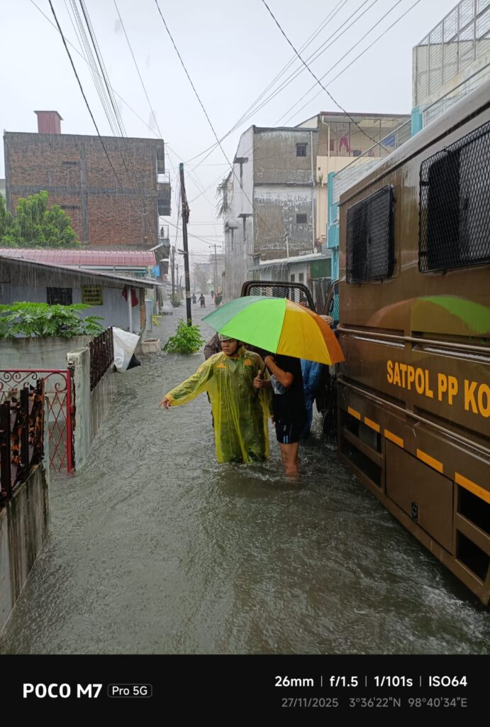 MEDAN, KLIK7TV.CO.ID – Satuan Satpol PP Kota Medan melaksanakan tugas lapangan pada saat ini di beberapa lokasi untuk meninjau beberapa lokasi terkena banjir akibat curah hujan yang cukup deras sepanjang hari ini tanggal 27 Nopember 2025.