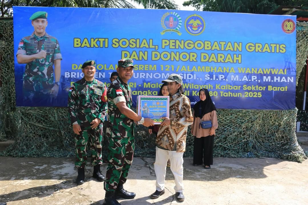 ENTIKONG, KLIK7TV.CO.ID – Dalam rangka memperingati Hari Ulang Tahun ke-80 Tentara Nasional Indonesia (TNI), Dankolakopsrem 121/ABW diwakili oleh Wadan Kolakopsrem 121/ABW Kolonel Inf Dadang melaksanakan Kegiatan Sosial di Pos Kotis Gabma Entikong, Satgas Pamtas RI-Malaysia Yonarhanud 1 Kostrad. Selasa (30/9/2025).