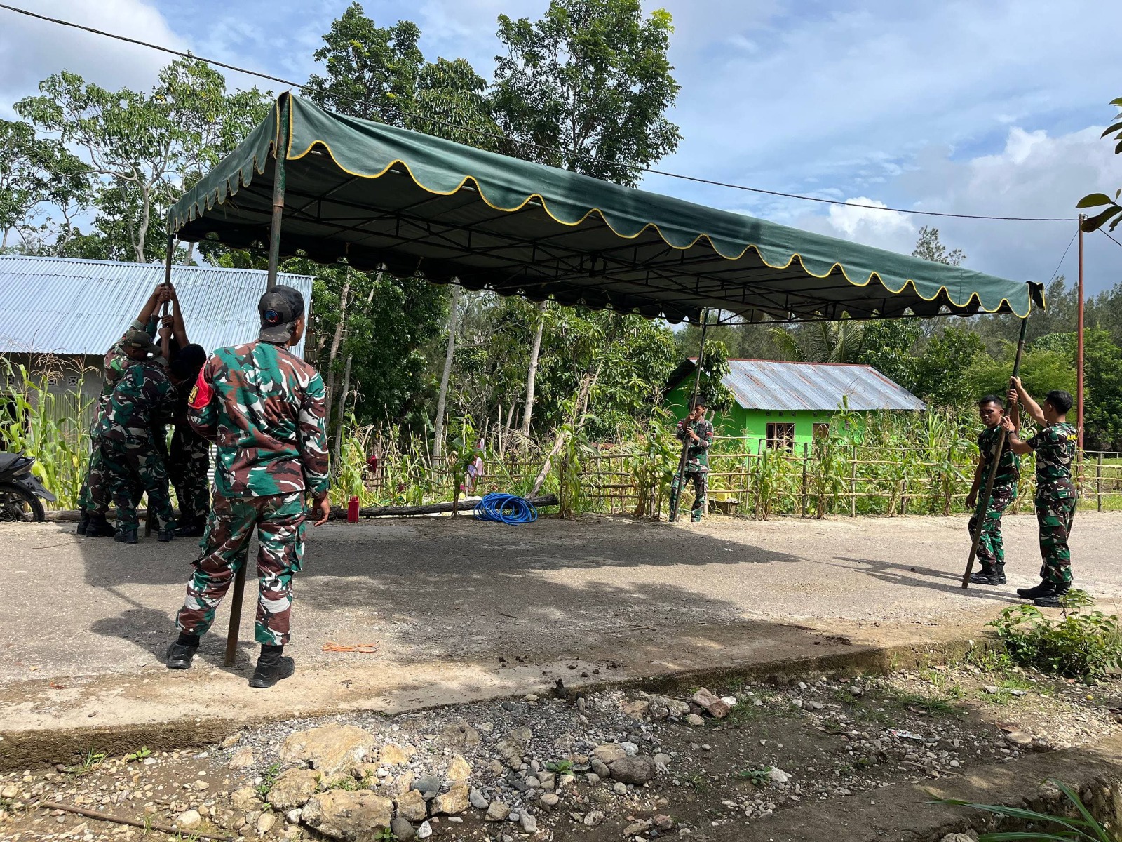 Personel Pos Haumeniana bersama masyarakat setempat bergotong royong mendirikan tenda sebagai bentuk kepedulian dan empati kepada keluarga yang sedang berduka. Kehadiran prajurit Satgas Pamtas di tengah masyarakat tersebut bertujuan untuk meringankan beban serta memberikan dukungan moral kepada keluarga yang ditinggalkan.