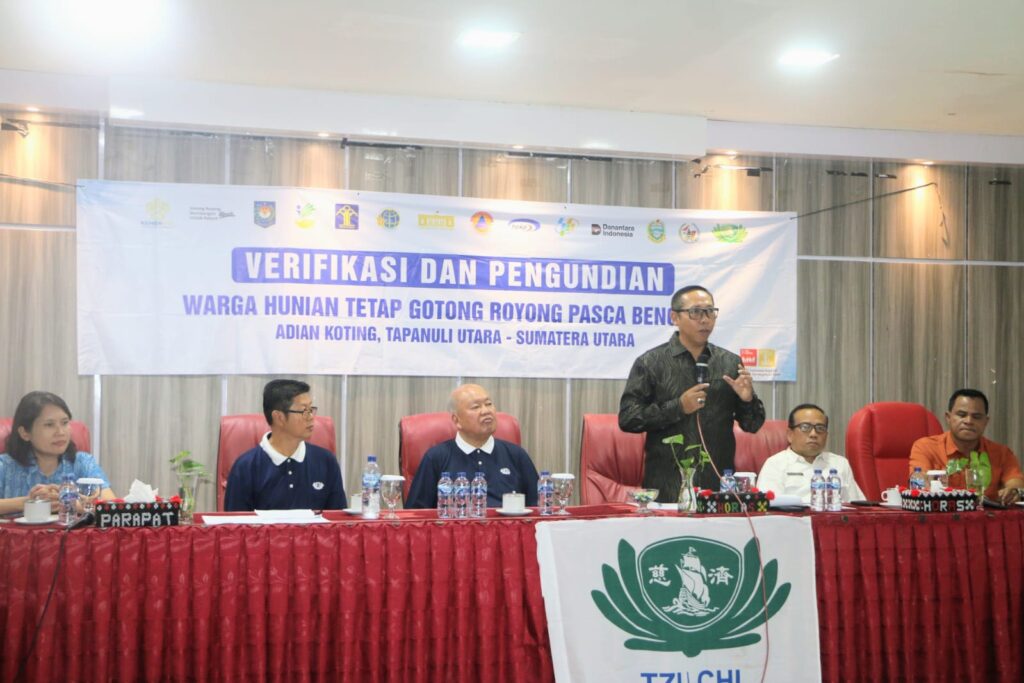 TAPUT. KLIK7TV.CO.ID.- Bupati Tapanuli Utara Dr. Jonius Taripar Parsaoran Hutabarat, S.Si., MSi., bersama Ketua Yayasan Bunda Tzu Chi Wilayah Sumatera Utara, para pimpinan Organisasi Perangkat Daerah (OPD), serta Camat melaksanakan kegiatan verifikasi dan pengundian 70 unit Hunian Tetap ‘Kampung Parsaoran Nauli’ Adiankoting, bertempat di Aula Martua Kantor Bupati Tapanuli Utara, Tarutung. (Sabtu/25 April 2026).