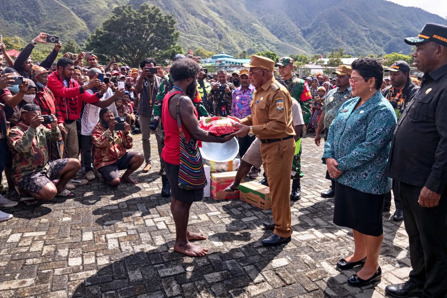 Bantuan sembako diberikan kepada masyarakat dari Distrik Mololanikeme, Kemburu, dan Bina yang mengungsi ke Puncak Jaya karena kondisi darurat di daerah asalnya. Dalam sambutannya, Bupati Elvis Tabuni menyampaikan bahwa kunjungan ini bertujuan untuk memberikan bantuan kepada masyarakat yang membutuhkan dan berharap pemerintah pusat, Panglima TNI, serta Polri akan mempertimbangkan kebutuhan daerah-daerah rawan. Ia juga mengucapkan terima kasih kepada pemerintah dan aparat keamanan TNI-Polri Kabupaten Puncak Jaya yang telah memberikan tempat perlindungan bagi masyarakat pengungsi.
