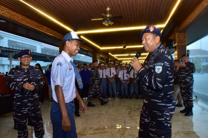 “Kalian adalah generasi penerus bangsa. Jangan pernah takut pada tantangan. Jadilah pemimpin yang berkarakter, bermental juang, dan siap mengabdi untuk Indonesia, dari darat hingga lautan,” ujar Laksda TNI Rudhi Aviantara dengan penuh semangat di hadapan para siswa, meskipun hujan mengguyur deras.
