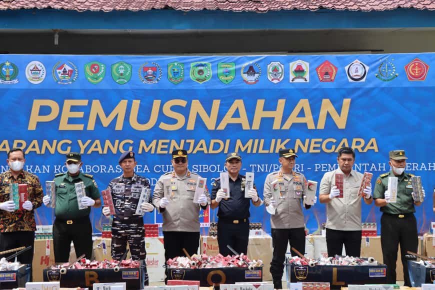 SIBOLGA. KLIK7TV.CO.ID – Kantor Pelayanan Pajak dan Bea Cukai (KPPBC) Tipe Pratama Sibolga, bersinergi dengan TNI dan Polri, melaksanakan pemusnahan Barang Milik Negara (BMN) hasil penindakan. Barang yang dimusnahkan didominasi oleh 1.351.388 batang rokok ilegal dan minuman keras (Minuman Mengandung Etil Alkohol/MMEA), dengan total nilai barang mencapai Rp1.882.244.740,00.