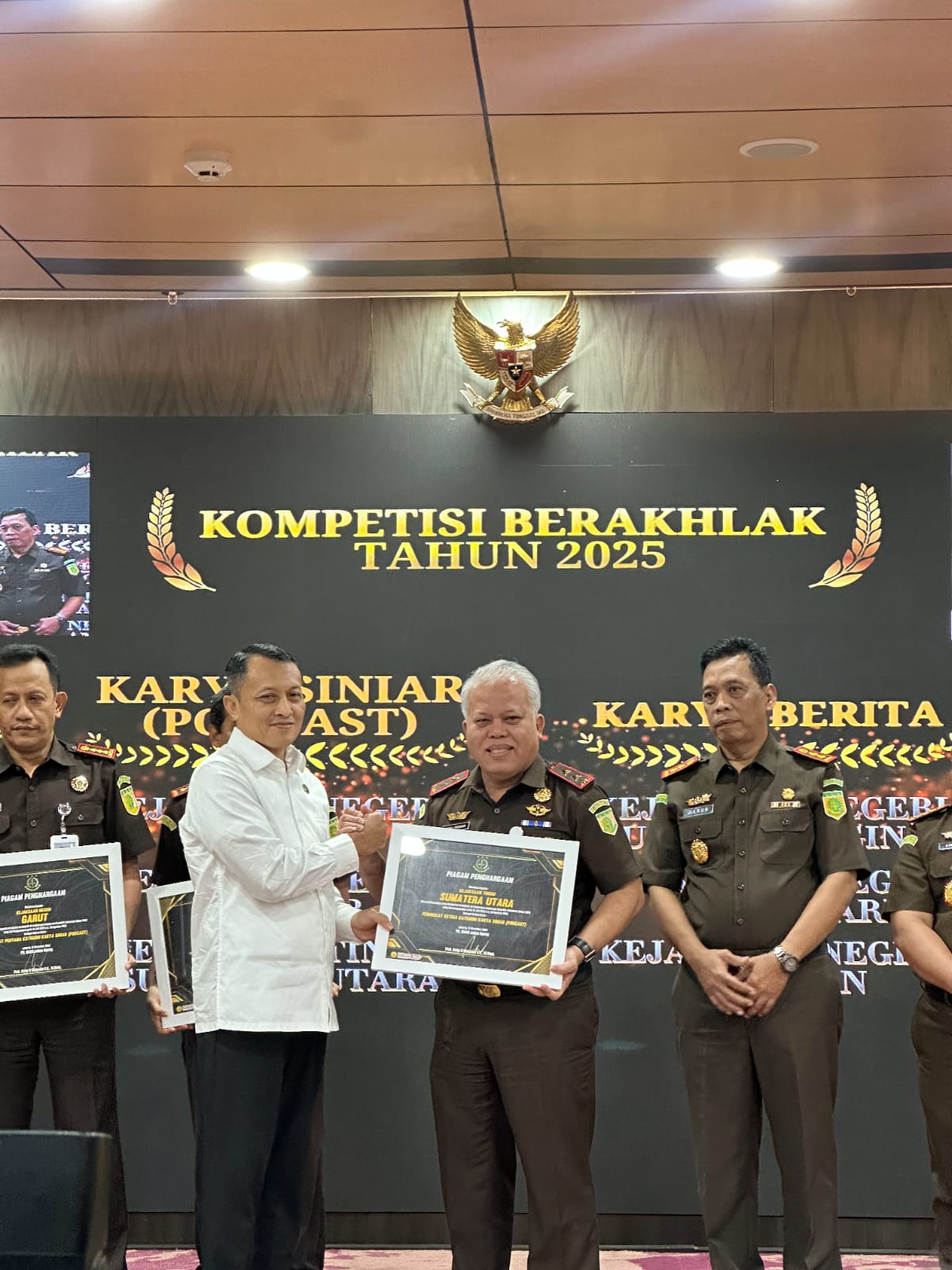 MEDAN, KLIK7TV.CO.ID – Kejaksaan Tinggi Sumatera Utara dianugerahi penghargaan dan apresiasi sebagai peringkat ke-III satuan kerja (Satker) kompetisi berAKHLAK tahun 2025 yang diserahkan oleh Wakil Jaksa Agung Republik Indonesia Prof.Dr.Asep N Mulyana diwakili Jaksa Agung Muda Pengawasan (JAMWAS) Prof Dr Rudi Margono dan diterima langsung oleh Kajati Sumatera Utara Dr.Harli Siregar, SH.,M.Hum di Jakarta pada hari Rabu 17/12/2025.