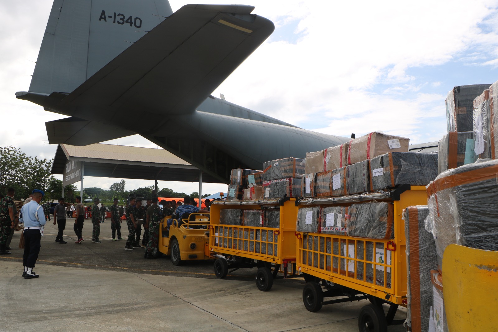 Komandan Lanud SIM Kolonel Nav Sudaryanto, S.M menyampaikan, pesawat Hercules tersebut membawa bantuan sosial (bansos) seberat 24,065 ton yang diterbangkan dalam dua sortie penerbangan.