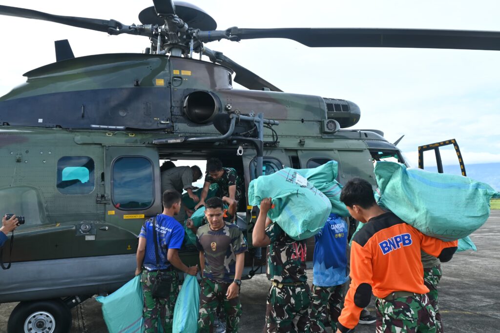 Tak hanya melalui jalur udara menggunakan pesawat angkut, distribusi bantuan juga dilakukan dengan helikopter. Dua helikopter Caracal HT-7202 dan HT-7205 dikerahkan untuk mengangkut bansos seberat 2,200 ton ke daerah Aceh Tengah dan Bener Meriah.