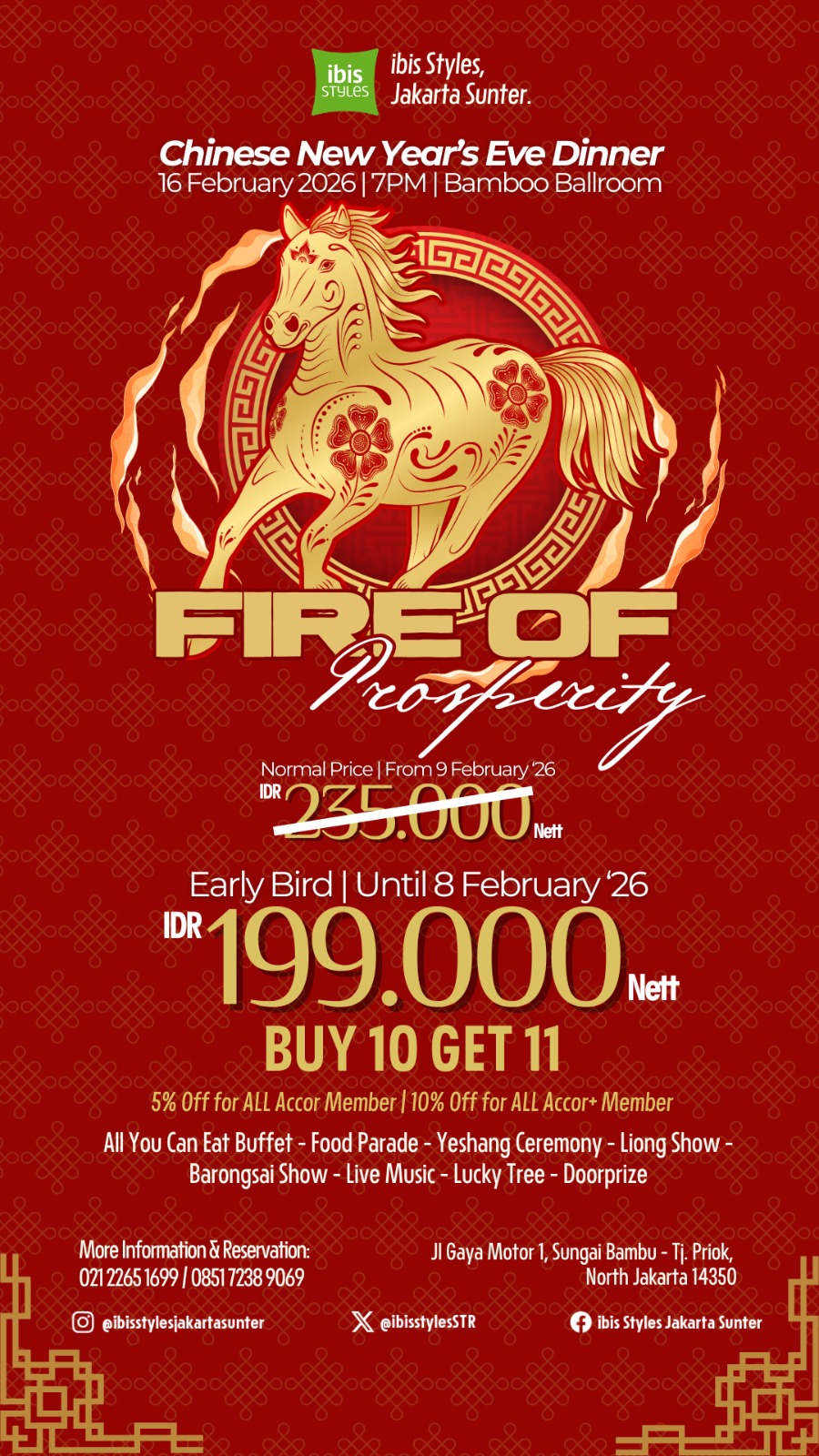 Menyambut Tahun Baru Imlek, Tahun Kuda Api di 2026 ini, ibis Styles Jakarta Sunter mempersembahkan acara spesial bertajuk “Fire of Prosperity”, sebuah perayaan Chinese New Year’s Eve Dinner yang akan diselenggarakan pada 16 Februari 2026, pukul 19.00 WIB di Bamboo Ballroom, ibis Styles Jakarta Sunter.