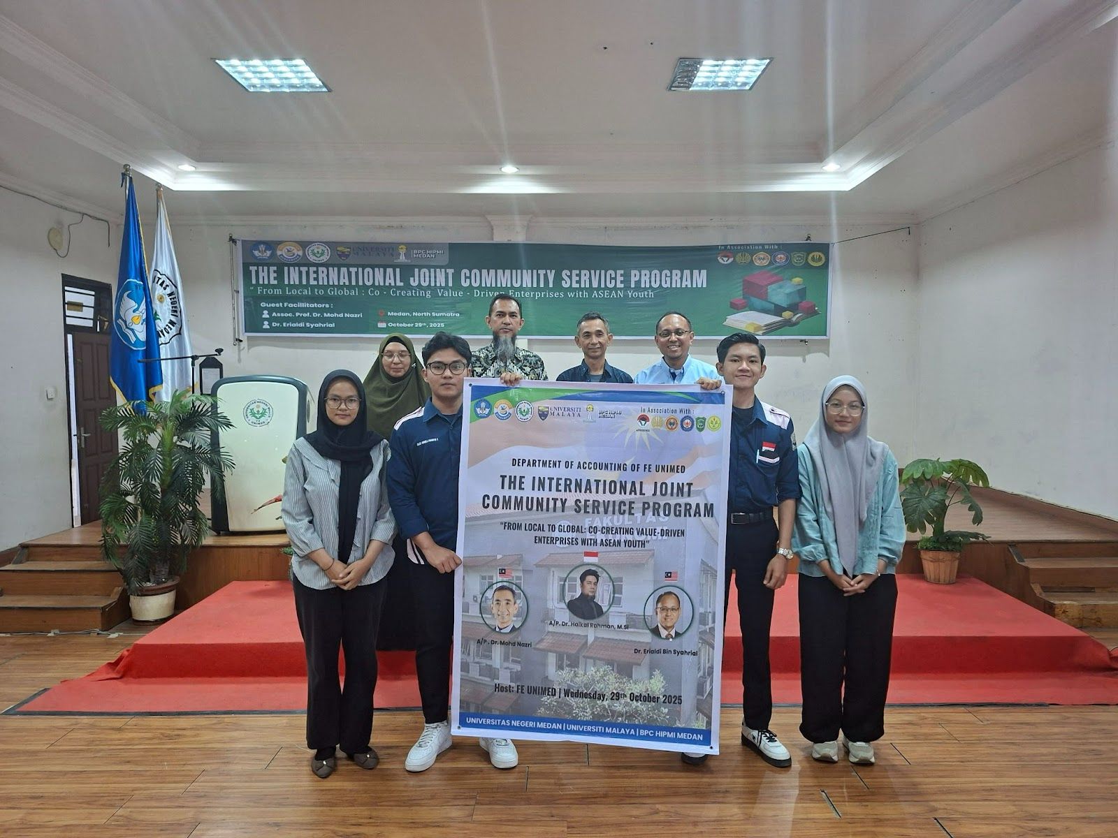 MEDAN, KLIK7TV. CO. ID – Prodi S1 Pendidikan Akuntansi, Prodi S1 Akuntansi dan Prodi S2 Akuntansi Fakultas Ekonomi Universitas Negeri Medan (FE UNIMED) bekerja sama dengan Faculty of Business and Economics (FBE) Universiti Malaya (UM) – Malaysia, Badan Pimpinan Cabang Himpunan Pengusaha Muda Indonesia (BPC HIPMI) Medan, Aliansi Profesi Pendidik Akuntansi (APRODIKSI) Wilayah Barat, Fakultas Ekonomi dan Bisnis Universitas Lambung Mangkurat (FEB ULM), Fakultas Keguruan dan Ilmu Pendidikan Universitas Halu Oleo (FKIP UHO), Fakultas Ekonomi dan Bisnis Universitas Negeri Surabaya (FEB UNESA) dan, Fakultas Ekonomi dan Bisnis Universitas Negeri Jakarta (FEB UNJ) menggelar kegiatan Program Kemitraan dan Pengabdian Masyarakat (PKM) internasional di Aula Fakultas Ekonomi UNIMED , Rabu (29/10/2025).