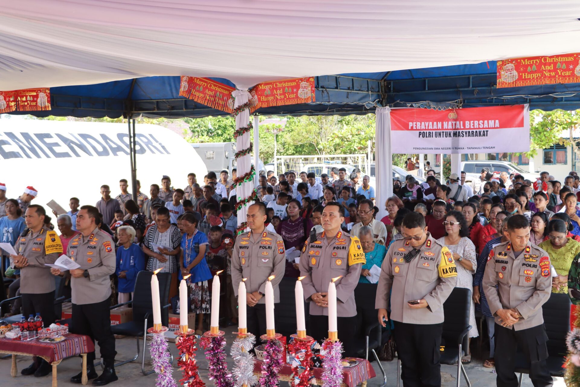 Acara Perayaan Natal di SMAN 1 Tukka dihadiri oleh Kapolda Sumatera Utara Irjen Pol Whisnu Hermawan Februanto, S.I.K., M.H. dan rombongan PJU Polda Sumut, Kapolres Tapanuli Tengah AKBP Wahyu Endrajaya, S.I.K, M.SI, Rombongan PJU Polres Tapteng, Camat Tukka Muharman Aritonang, Pdt. Juniaro Mendrofa, S.Th., M.Pd. Pengungsi Korban Bencana Alam yang berada di Posko Pengungsian SMAN 1 Tukka yang beragama Kristen.
