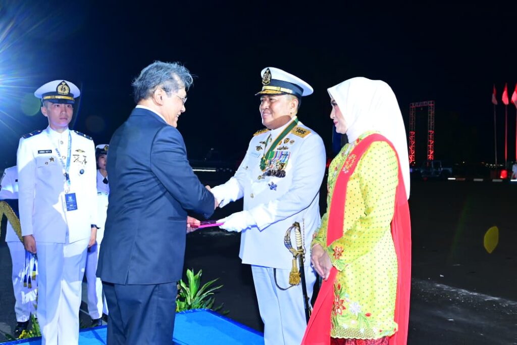 Di tengah acara Kasal didampingi Ketua Umum Jalasenastri Ny. Fera Muhammad Ali menyerahkan piagam penghargaan dan cinderamata kepada perwakilan wisudawan dalam hal ini adalah Laksdya TNI (Purn.) Prof. Amarulla Octavian beserta Ny. Anna Amarulla Octavian.