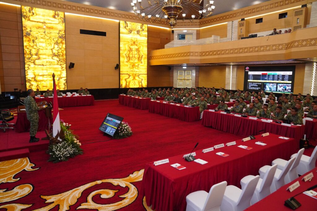 Rakor Ter TNI TA 2026 diikuti pejabat teritorial dari tiga matra TNI serta unsur Komando Kewilayahan, baik hadir langsung maupun melalui video conference. Kegiatan ini menjadi forum untuk menyamakan persepsi, memperkuat koordinasi, serta meningkatkan peran Aparat Komando Kewilayahan (Apkowil) dalam mendukung pembinaan teritorial di seluruh wilayah Indonesia.