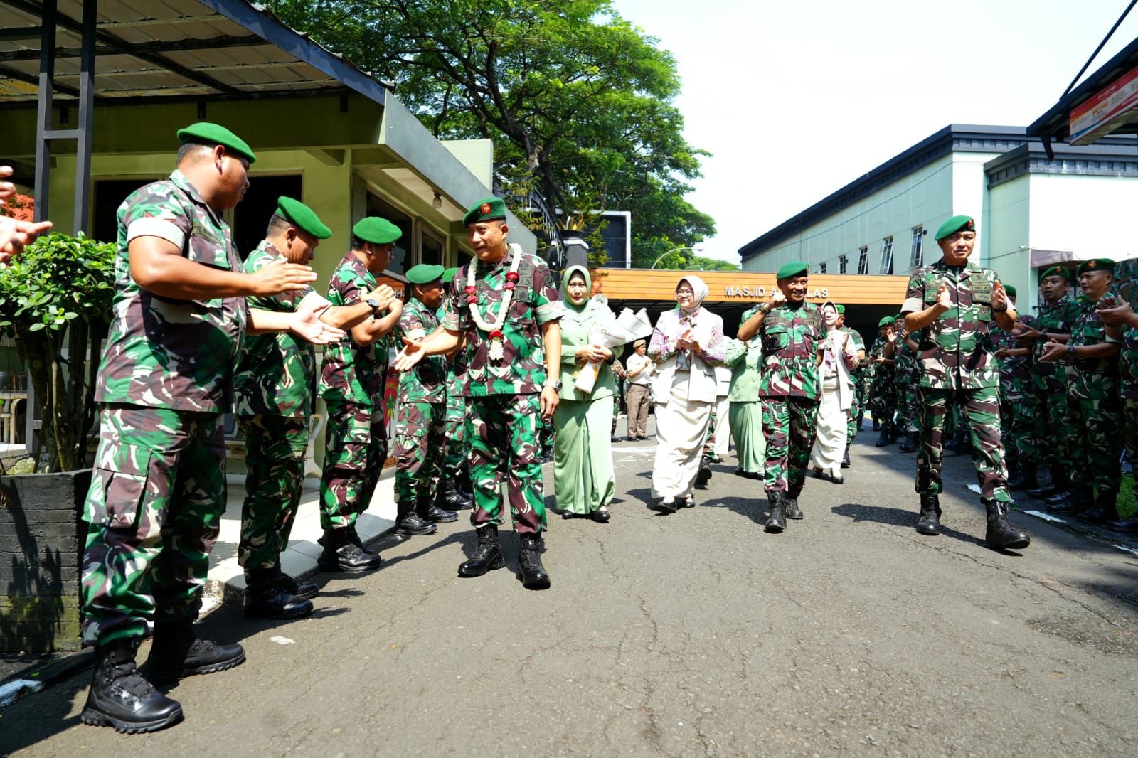 Sebagai tanda penghormatan dan selamat datang, Kasrem 052/Wkr mengalungkan bunga kepada Danrem 052/Wkr yang baru, sementara Ibu Kasrem menyerahkan hand bouquet kepada Ibu Danrem.