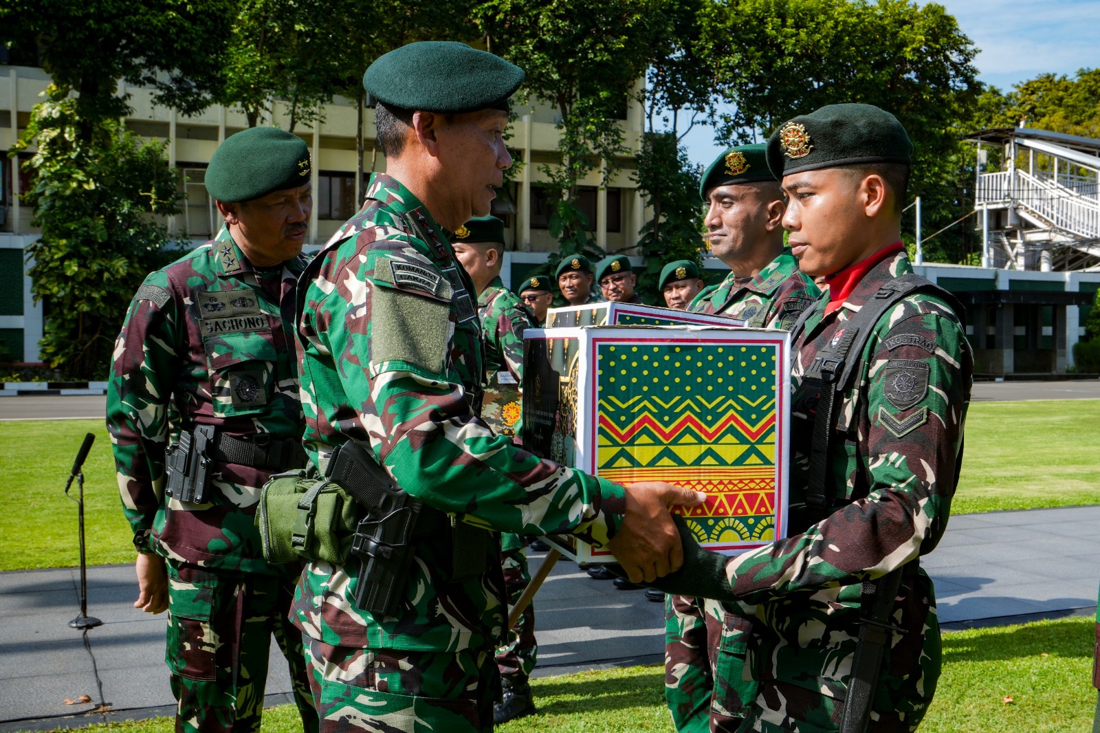 Selain memimpin upacara, Pangkostrad juga menyerahkan bingkisan lebaran secara simbolis kepada perwakilan prajurit dan PNS Kostrad.