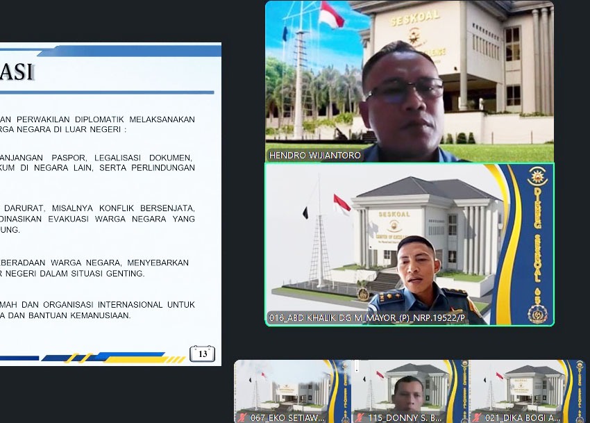 JAKARTA, KLIK7TV..CO.ID – Perwira Siswa Pendidikan Reguler Sekolah Staf dan Komando Angkatan Laut (Pasis Dikreg Seskoal) angkatan ke-65 TA 2026 melaksanakan kegiatan proses belajar mengajar (PBM) online mata pelajaran Perlindungan Warga Negara Indonesia (WNI) di luar negeri, yang diberikan oleh Dosen SBS Sistem Pembinaan Latihan (Sisbinlat) Letkol Marinir Hendro Wijiantoro, S.H., M.Tr.Opsla., Rabu (25/03/2026).