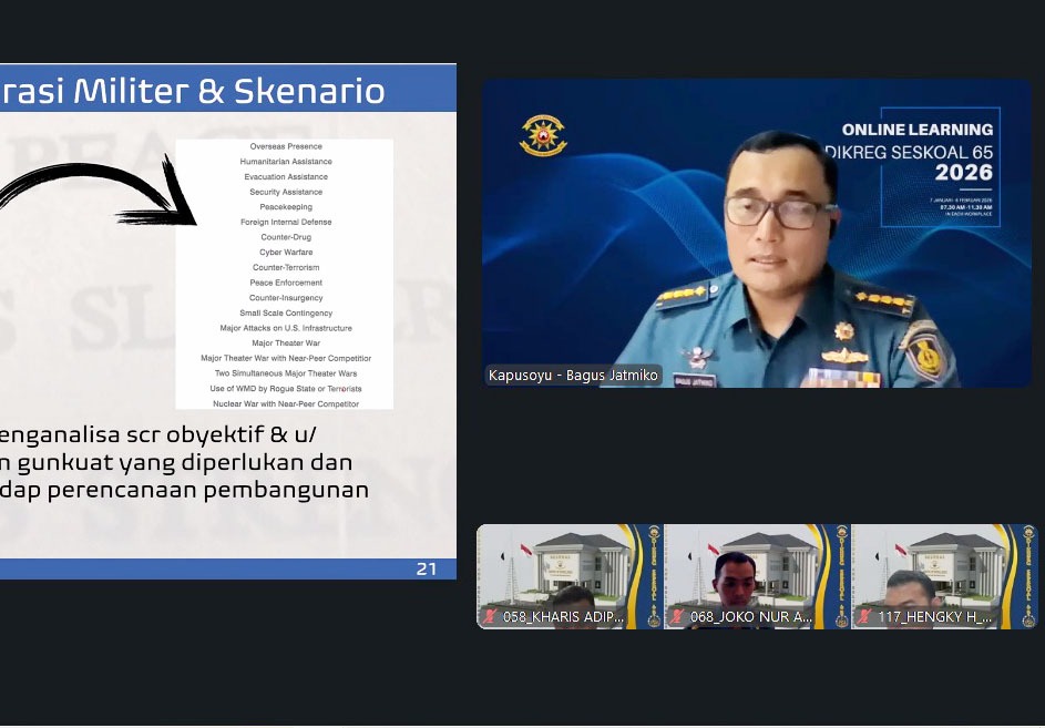 JAKARTA, KLIK7TV.CO.ID – Perwira Siswa Pendidikan Reguler Sekolah Staf dan Komando Angkatan Laut (Pasis Dikreg Seskoal) angkatan ke-65 TA 2026 melaksanakan kegiatan proses belajar mengajar (PBM) online mata pelajaran Rencana Pengembangan Kekuatan (Renbangkuat) TNI Angkatan Laut, yang diberikan oleh Kepala Pusat Olah Yudha (Kapusoyu) Seskoal Kolonel Laut (P) Dr. Bagus Jatmiko, S.H., M.Sc., M.Tr.Hanla., Rabu (25/03/2026).