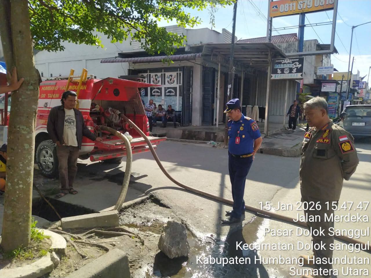 HUMBAHAS., KLIK7TV- Pemerintah Kabupaten Humbang Hasundutan respon cepat menindaklanjuti kondisi gorong-gorong yang tersumbat di Jalan Merdeka. Kepala Satuan Polisi Pamong Praja Kabupaten Humbang Hasundutan, Andi Sihombing, memimpin langsung tim Pemadam Kebakaran Humbang Hasundutan melakukan pembersihan gorong-gorong di depan Mal Pelayanan Publik (MPP) Doloksanggul, Kamis, (15/1).