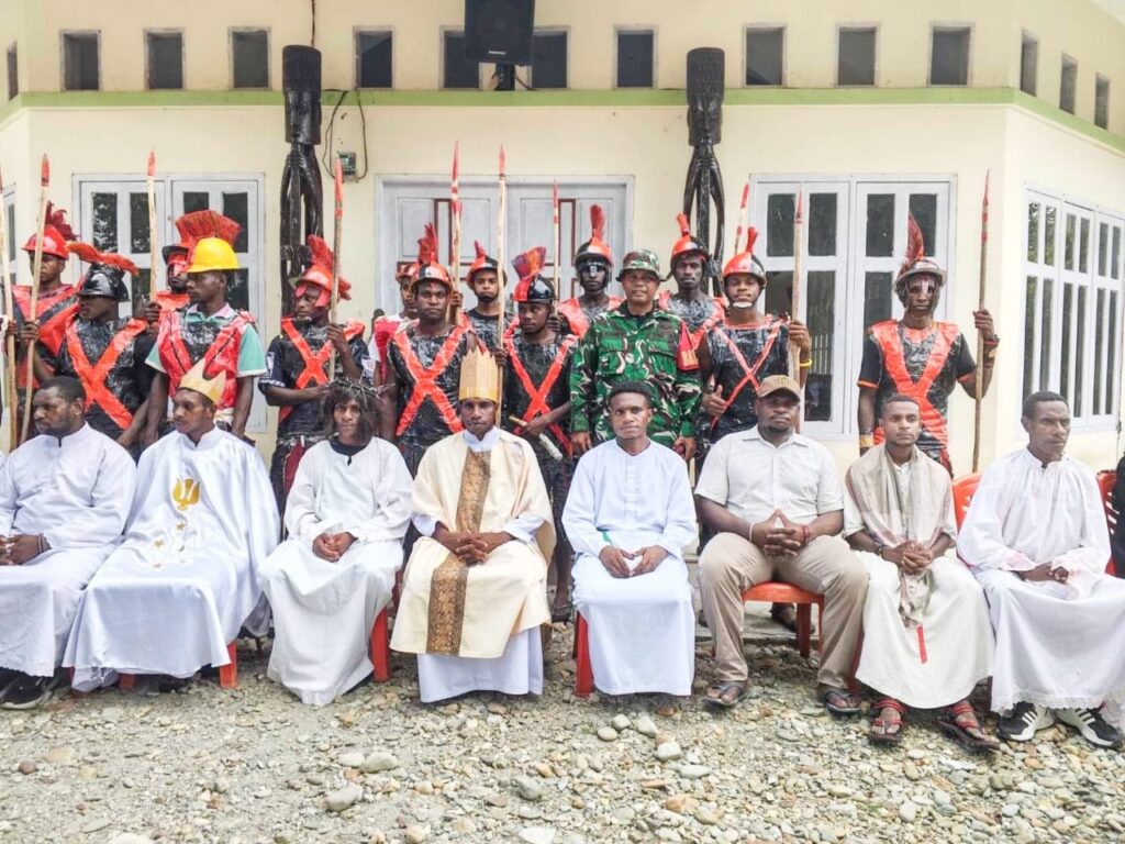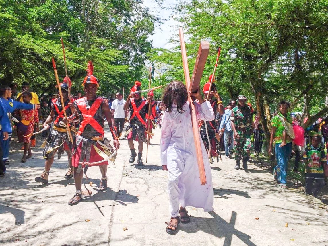 TIMIKA, KLIK7TV. CO..ID – Babinsa Koramil 1710-07/Mapurujaya, Sertu Yulius Nampe, melaksanakan pengamanan kegiatan ibadah dan prosesi jalan salib yang berlangsung di Distrik Mimika Timur, Jumat (3/4/2026). Kegiatan jalan salib tersebut diikuti oleh masyarakat setempat sebagai bagian dari rangkaian peringatan keagamaan. Prosesi dilaksanakan dengan berjalan kaki menyusuri rute dari Kampung Muare menuju Kampung Kaugapu sambil membawa simbol-simbol keagamaan.