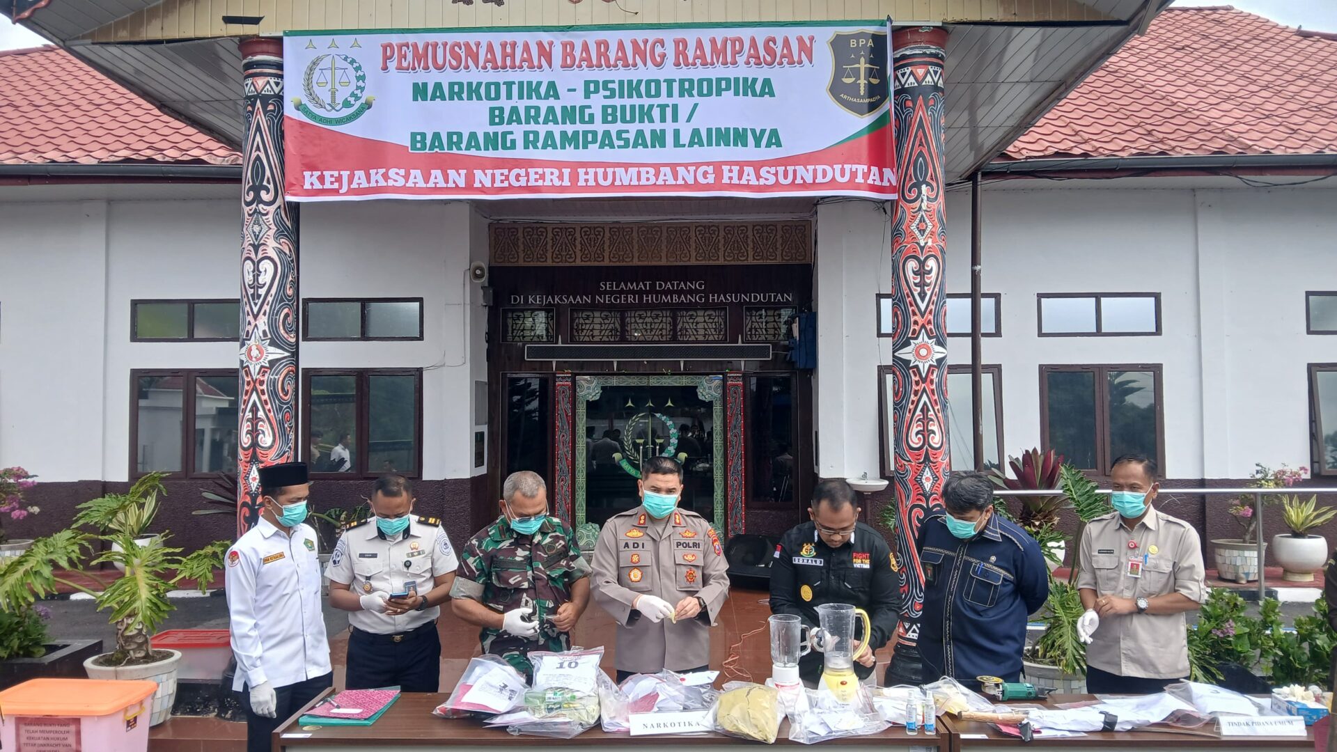 Pemusnahan barang bukti dipimpin langsung oleh Kepala Kejaksaan Negeri Humbang Hasundutan, Donald T.J. Situmorang, S.H., M.H., dan dihadiri oleh Kapolres Humbang Hasundutan AKBP Adi Nugroho, S.H., S.I.K., Danramil 05/DS 0210-TU Kapten Inf Sahat Manullang, Kepala Dinas Kesehatan Humbang Hasundutan Alex Gultom, perwakilan Pengadilan Negeri Tarutung, perwakilan Kementerian Agama Humbang Hasundutan, para Kepala Seksi dan Kasubbag Kejaksaan Negeri Humbang Hasundutan, tokoh masyarakat, tokoh agama, serta undangan lainnya.