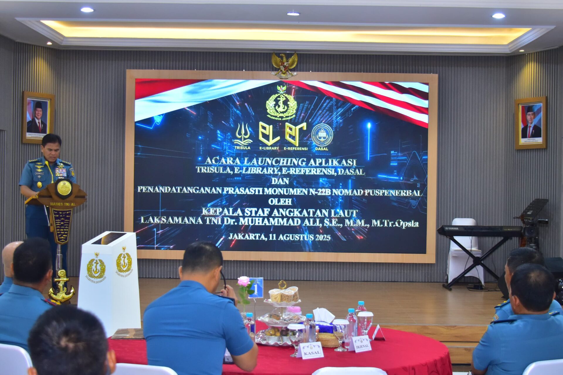 JAKARTA, -KLIK7TV.CO.ID – Dalam rangka memperkuat transformasi digital dan sistem komunikasi militer yang aman, TNI Angkatan Laut resmi meluncurkan sejumlah inovasi teknologi, yaitu aplikasi Trisula, sistem E-Library, E-Referensi, serta Depo Arsip Sejarah Angkatan Laut (Dasal). Pada kesempatan yang sama, turut diresmikan pula prasasti Monumen N-22B Nomad Puspenerbal.