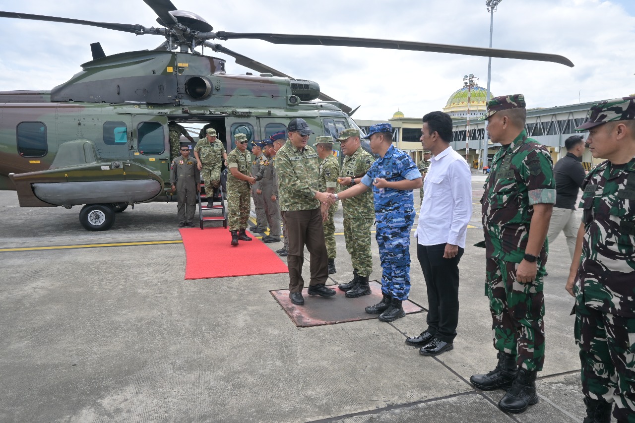 Setelah tiba di Aceh, Menhan RI dan rombongan langsung melanjutkan perjalanan menuju Batalyon BPT 857/GG di Kabupaten Pidie menggunakan dua heli EC-725/H225M Caracal dari Skadron Udara 8. Mobilisasi udara ini memastikan rangkaian kunjungan berjalan efisien dan tepat waktu.