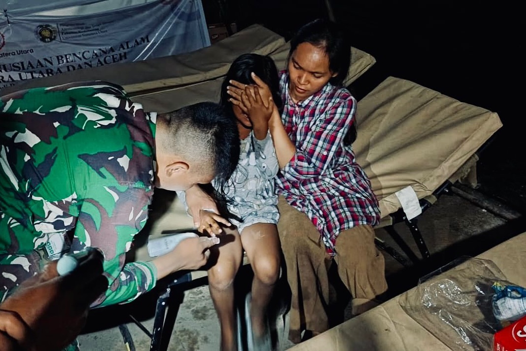Prajurit Kesehatan Batalyon Zeni Tempur 10 Kostrad memberikan pelayanan kesehatan pasca bencana kepada masyarakat terdampak di wilayah Kabupaten Aceh Tamiang, Mereka tergabung dalam Satuan Tugas Kesehatan (Satgas Kes).
