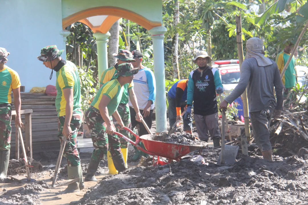 LUMAJANG, KLIK7TV. CO ID – Prajurit TNI, warga dan relawan masih berjibaku dengan lumpur yang menutupi rumah warga di Desa Supiturang, Kecamatan Pronojiwo, pasca erupsi Gunung Semeru. Dengan penuh semangat, mereka bahu-membahu membersihkan material vulkanik yang menghambat aktivitas masyarakat. Lumajang (25/11/2025).
