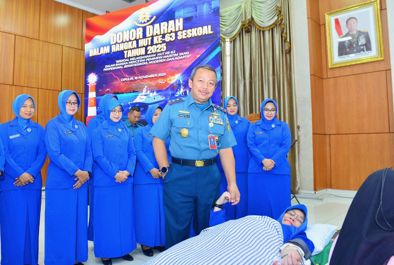 CIPULIR, KLIK7TV.CO.ID – Komandan Sekolah Staf dan Komando Angkatan Laut (Danseskoal) Laksamana Muda TNI Ariantyo Condrowibowo didampingi Ketua Cabang Berdiri Sendiri Jalasenastri Seskoal Ny. Dian Ariantyo Condrowibowo meninjau langsung donor darah dalam rangka menyambut Hari Ulang Tahun (HUT) ke-63 Seskoal yang jatuh pada tanggal 26 November 2025. Selesai meninjau pelaksanaan donor darah, Ketua Cabang Berdiri Sendiri Jalasenastri Seskoal melaksanakan donor darah. Kegiatan donor darah ini dilaksanakan atas kerja sama Satuan Kesehatan (Satkes) Seskoal dengan Unit Transfusi Darah (UTD) Rumah Sakit Kanker Dharmais menggelar Bakti Sosial Donor Darah, bertempat di pendopo gedung Jos Soedarso Seskoal, Cipulir, Kebayoran Lama, Jakarta Selatan, Selasa (18/11/2025).