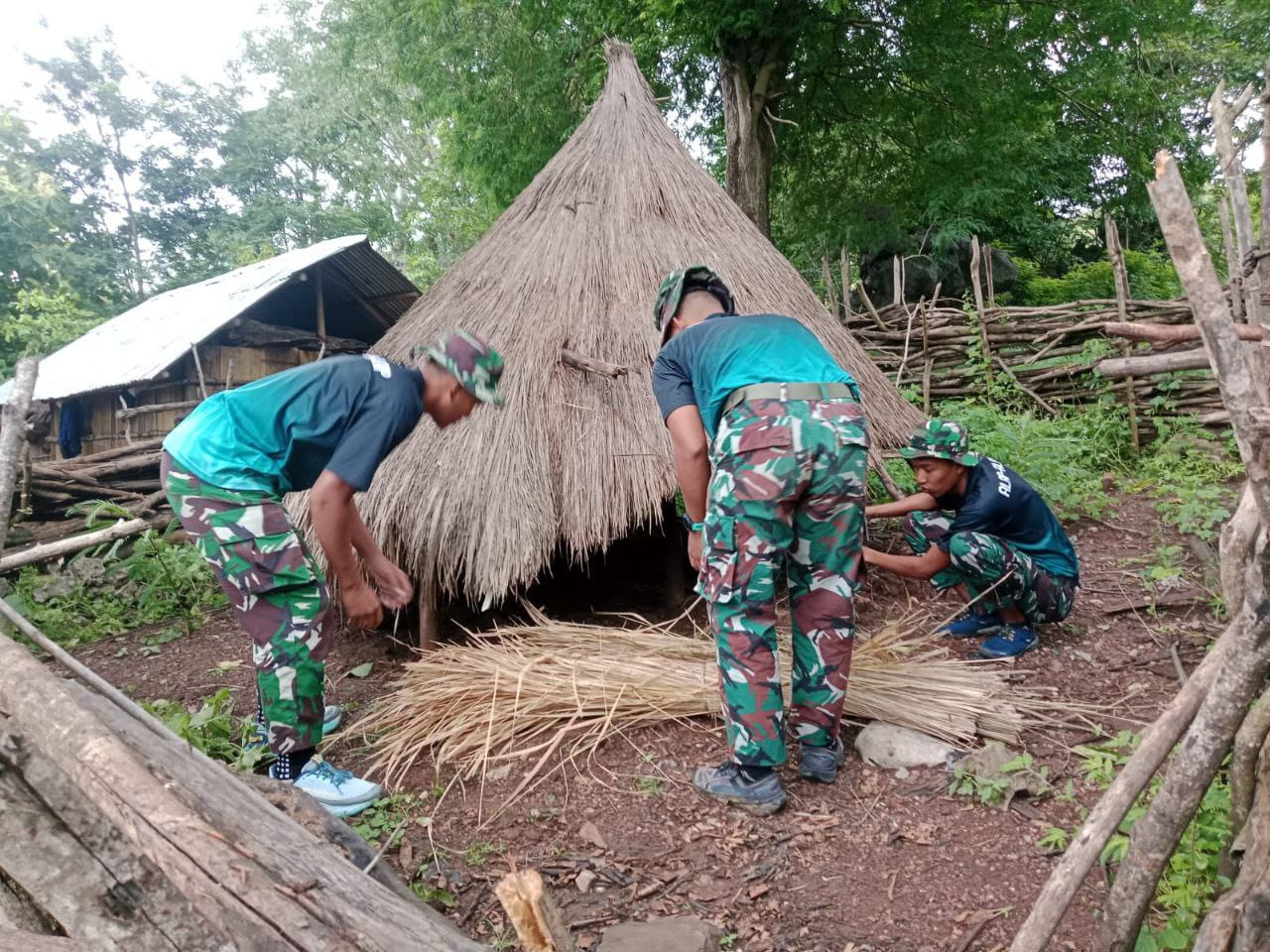 Personel Pos Naekake bersama warga bahu-membahu membongkar bagian pondok yang sudah tidak layak dan menggantinya dengan material yang lebih kokoh.