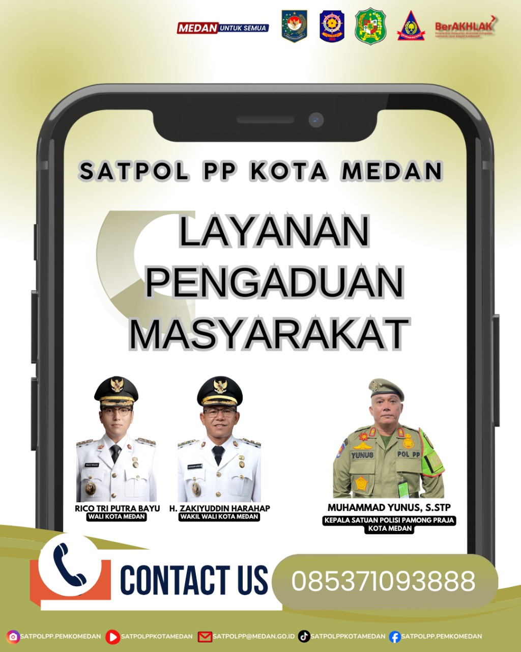 Kepala Satuan Polisi Pamong Praja Kota Medan Muhammad Yunus menghimbau kepada seluruh warga Kota Medan, Khususnya dalam rangka percepatan dalam penanganan dan tindak lanjut pengaduan masyarakat terkait dengan tugas kami dalam penegakan perda ketentraman ketertiban umum dan perlindungan masyarakat, kami telah membuka layanan pengaduan di nomor 0853-7109-3888. Silahkan kepada warga kota medan menyampaikan pengaduan kepada nomor layanan yang telah kami sampaikan, semoga ini dapat berguna dan mempercepat untuk meningkatkan kinerja satuan polisi pamong praja kota medan.
