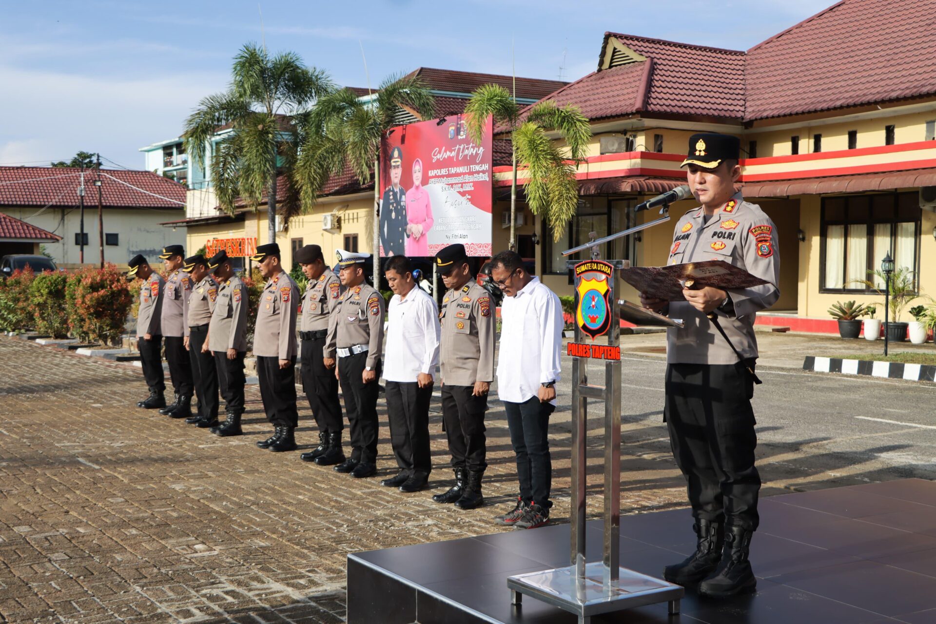 PANDAN. KLIK7TV.CO.ID – Kapolres Tapanuli Tengah yang baru, AKBP Muhammad Alan Haikel, S.K.M, S.I.K, M.I.K, memimpin apel pagi perdana di lapangan Mapolres Tapteng pada Senin (12/1/2026). Dalam arahannya, Kapolres menyoroti penanganan pascabencana alam yang melanda wilayah Tapanuli Tengah serta penguatan internal kepolisian.