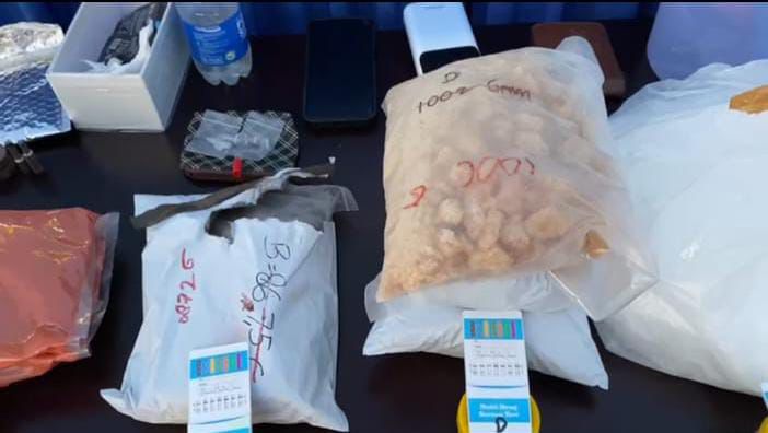 Dari hasil pemeriksaan, ditemukan beberapa barang bukti berupa narkotika, yang diduga bahan baku ekstasi dalam bentuk serbuk dan kristal sebanyak 8 kantong dengan rincian, jenis kristal seberat 3.882 gram, jenis serbuk warna merah 2.000 gram, serbuk warna abu-abu seberat 872 gram dan serbuk warna putih yang seberat 2.636 gram dengan jumlah total keseluruhan 9.390 gram.