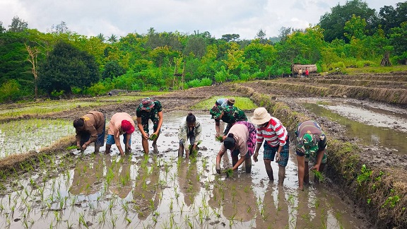 Nainaban – Prajurit Satgas Pamtas RI–RDTL Sektor Barat dari Batalyon Artileri Pertahanan Udara 2 Kostrad Pos Baen memberikan bantuan kepada masyarakat perbatasan yang hendak menanam padi sebagai implementasi penguatan ketahanan pangan di Desa Nainaban, Kecamatan Bikomi Nilulat, Kabupaten Timor Tengah Utara (TTU), Senin (23/02/2026).