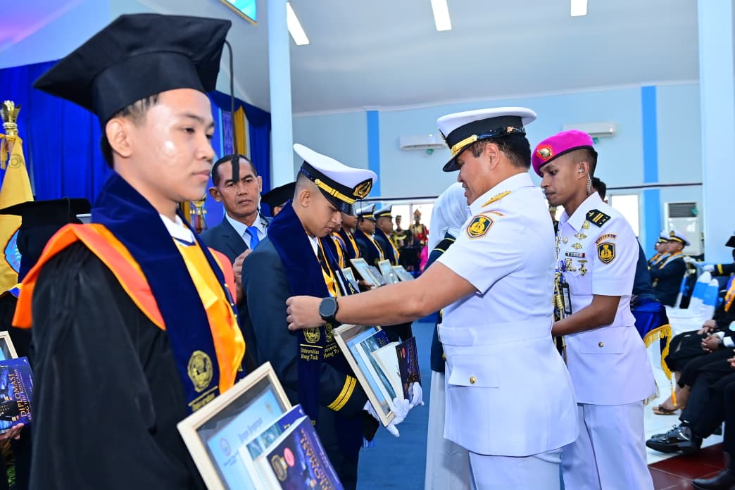 Lebih lanjut, Kasal juga menyampaikan apresiasi kepada seluruh orang tua, wali wisudawan dan keluarga, serta ketua dan pengurus Yayasan Nala, rektor, para dosen serta seluruh staf Universitas Hang Tuah atas dukungan, bimbingan, dan dedikasi dalam penyelenggaraan pendidikan yang berkualitas dan berkarakter bagi para wisudawan Kampus Laut Biru. “Teruslah brrkembang dan berkarya demi meningkatkan kualitas kehidupan pribadi, bernegara dan berbangsa yang lebih baik,” tegas Kasal.