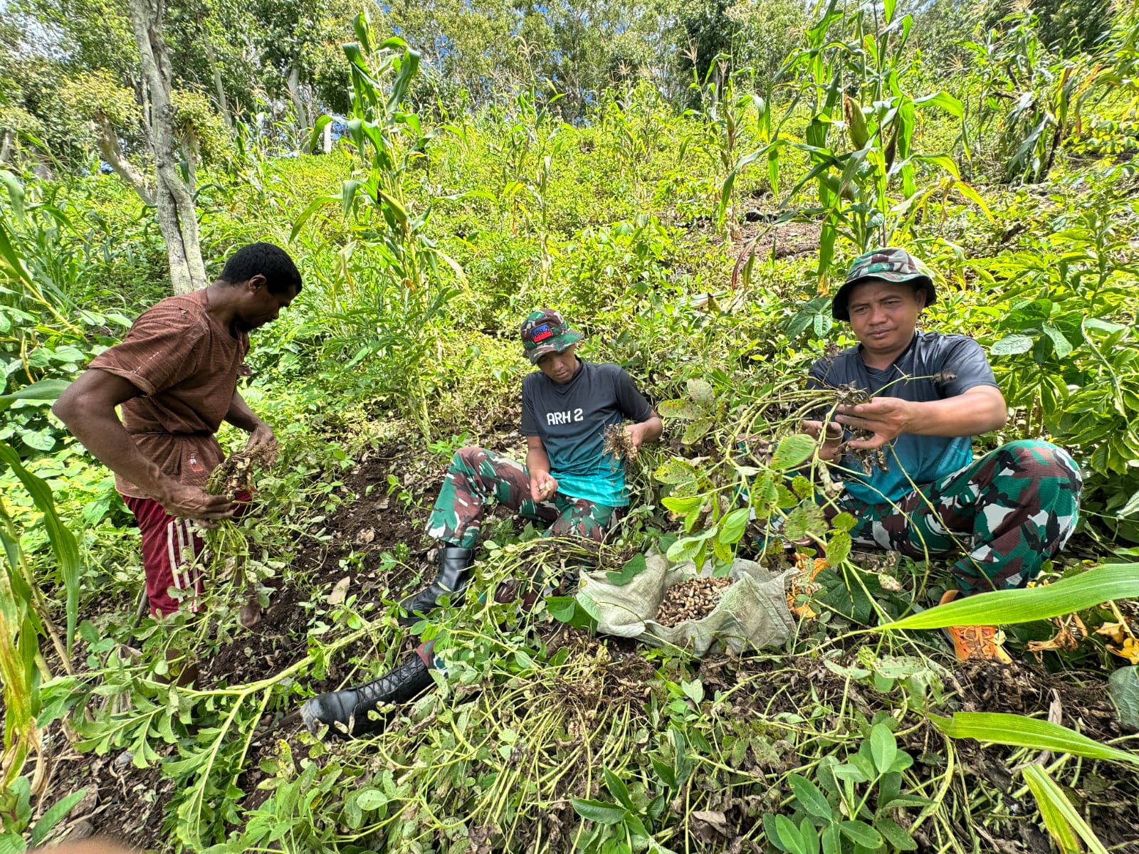 SUNSAE , KLIK7TV.CO.ID – Satgas Pamtas RI-RDTL Sektor Barat Yonarhanud 2 Kostrad Pos Nelu membantu warga perbatasan memanen kacang tanah di Desa Sunsea, Kec. Naibenu, Kab. TTU. Jumat (10/04)