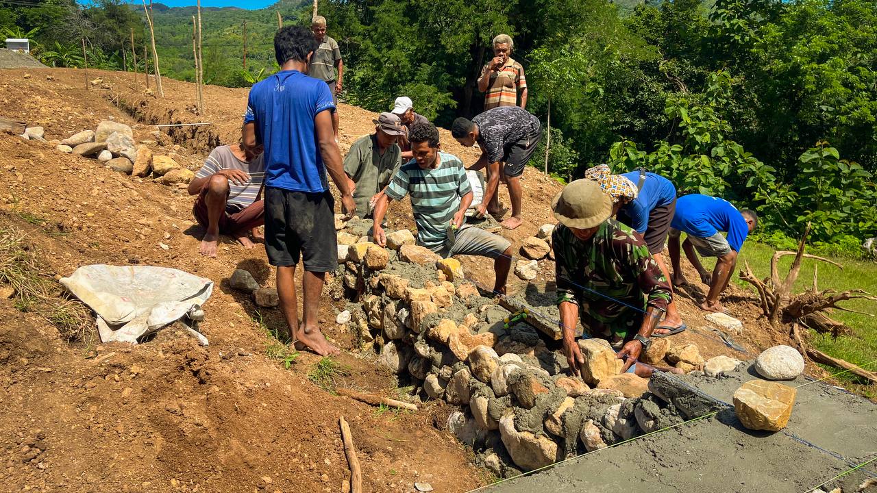 Dalam pelaksanaannya, personel Satgas Pamtas bersama masyarakat melaksanakan berbagai tahapan pekerjaan, mulai dari pemasangan tali, pengadukan semen, penyusunan batu, pemasangan kawat, hingga pemecahan batu menjadi kerikil. Kegiatan ini mencerminkan semangat gotong royong antara TNI dan masyarakat setempat.
