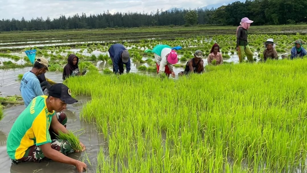 Personel Pos Turiskain bersama para petani turun langsung ke sawah dan bergotong royong menanam padi dengan penuh semangat. Suasana kekeluargaan tampak jelas selama kegiatan berlangsung, mencerminkan sinergi positif antara prajurit TNI dan masyarakat dalam mendukung sektor pertanian lokal.