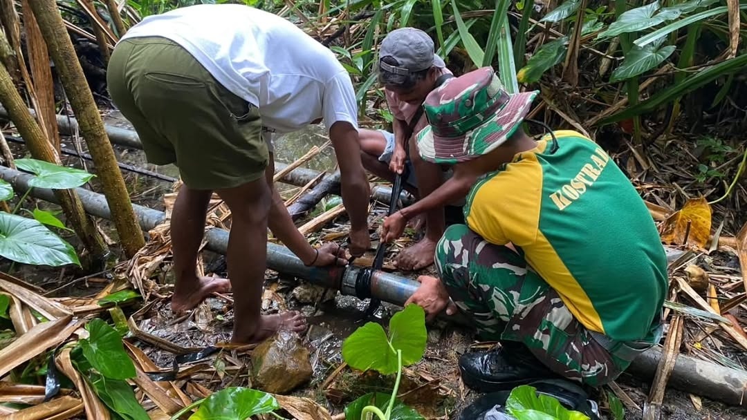 Personel Satgas bersama warga setempat bergotong royong membersihkan saluran air agar alirannya kembali lancar dan dapat memenuhi kebutuhan sehari-hari masyarakat.